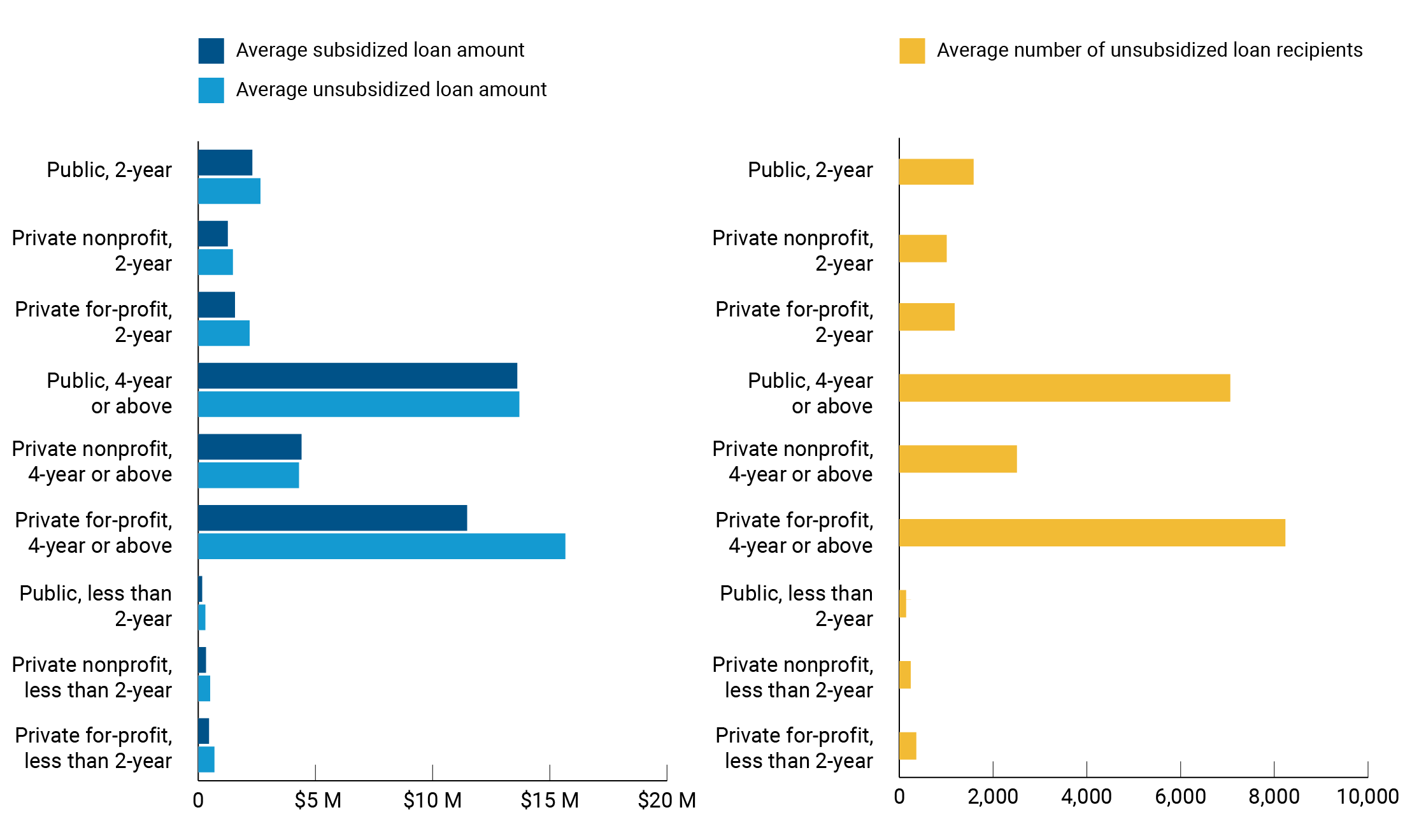 Source: Calculations based on data from Federal Student Aid, “2019–2020 Award Year Direct Loan Volume by School, Quarter 4,” Title IV Program Volume Report (Washington, DC: U.S. Department of Education, 2022); College Scorecard Institutional Data, 2018–19 (Washington, DC: U.S. Department of Education, 2022).